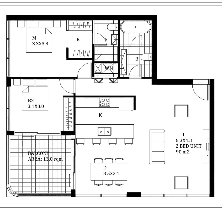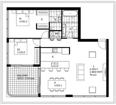 2-Bedroom Unit  Unit Type: 2 bedroom 2 bathroom 1 Car  Size: 90 sqm + 13 sqm Balcony