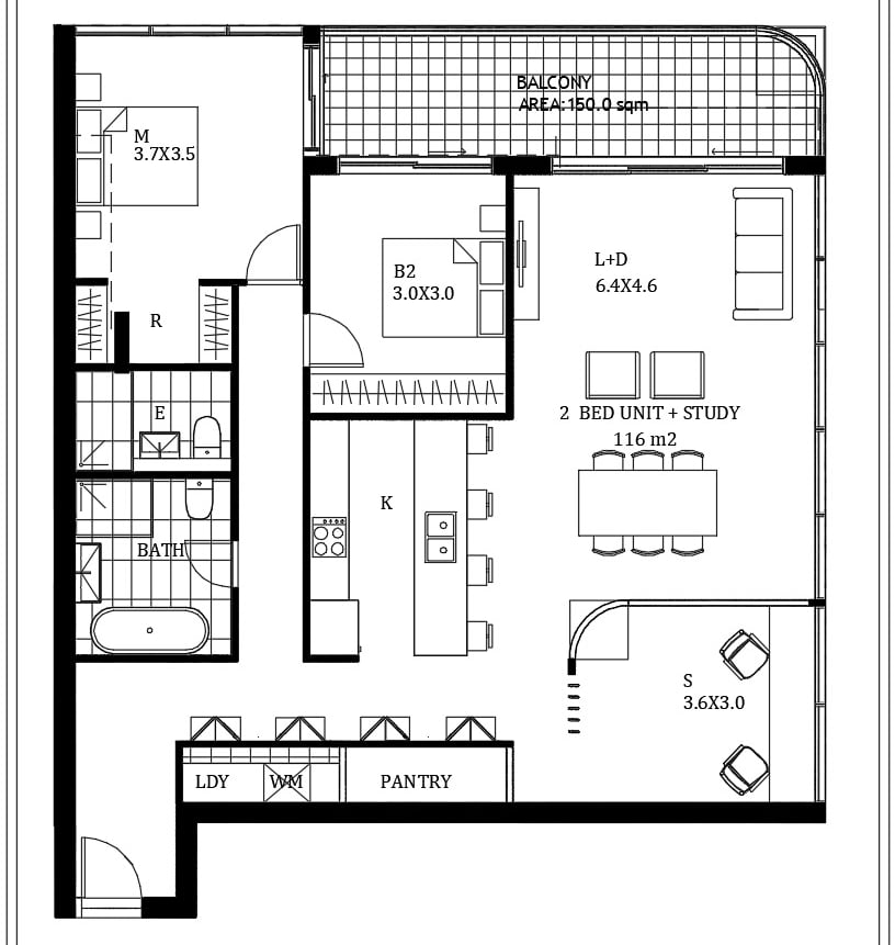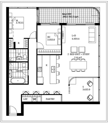 2-Bedroom Plus Study (virtually 3 Bed)  Unit Type: 2 bedroom 2 bathroom Study 1 Car  Size: 116 sqm + 15 sqm Balcony